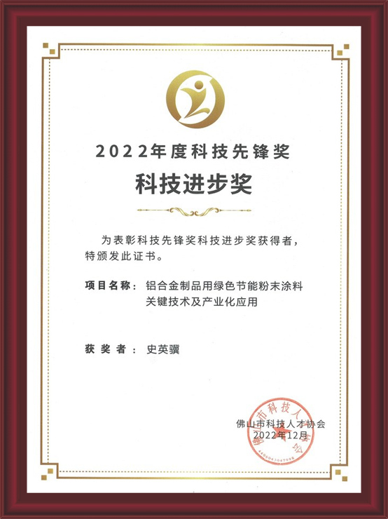 • 科技進步獎《鋁合金制品用綠色節(jié)能粉末涂料關(guān)鍵技術(shù)及產(chǎn)業(yè)化應用》