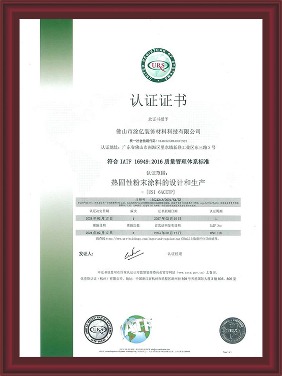 • IATF 16949:2016 質(zhì)量管理體系標(biāo)準(zhǔn)(熱固性粉末涂料的設(shè)計和生產(chǎn))